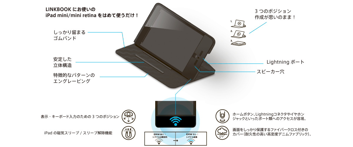 LINKBOOK for iPad mini/mini Retinaは、WIFI(2.4GHz)のシグナルを最大2倍拡張するEMWエレメントを備えたiPad mini/mini Retina用のケースです。