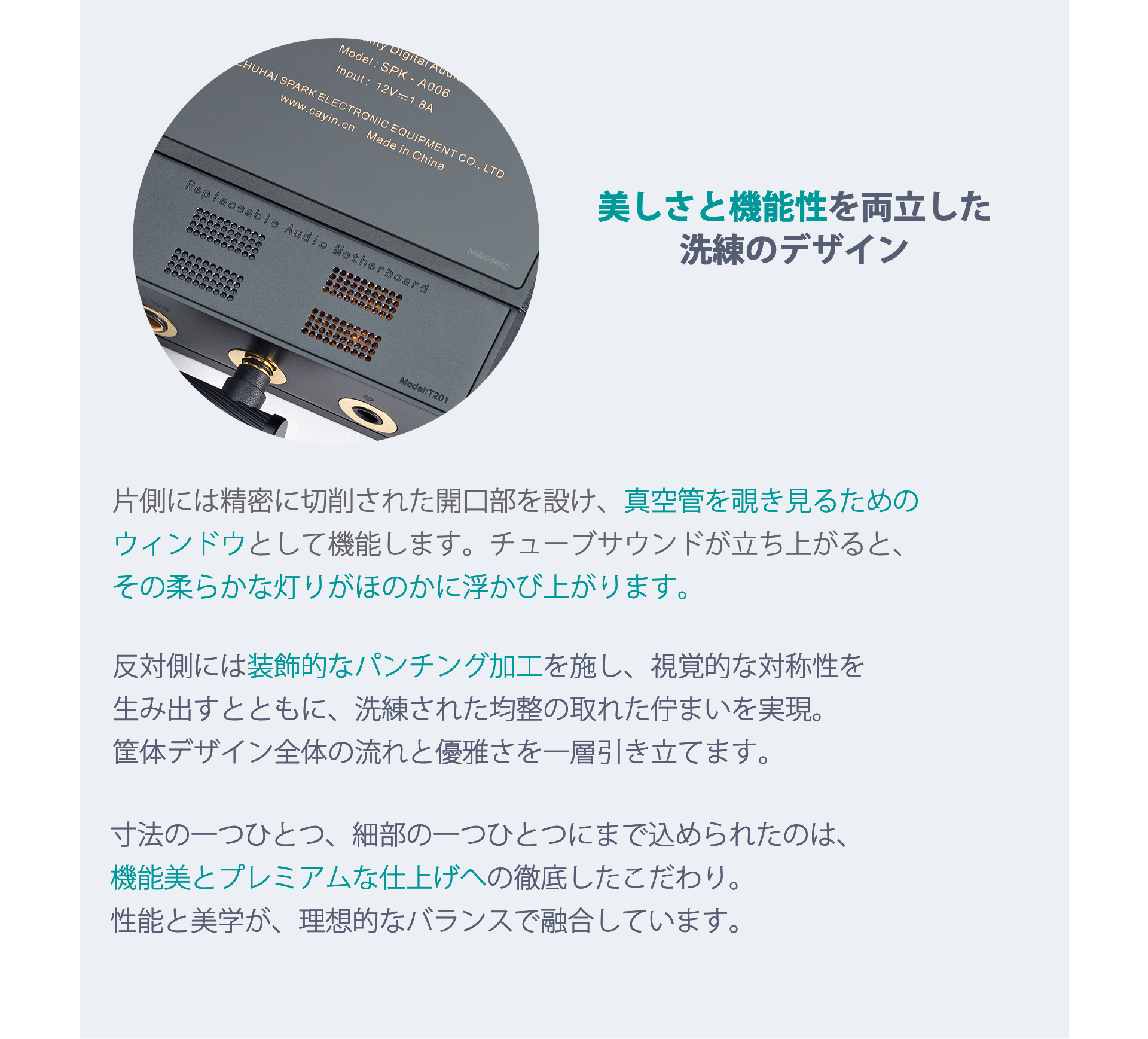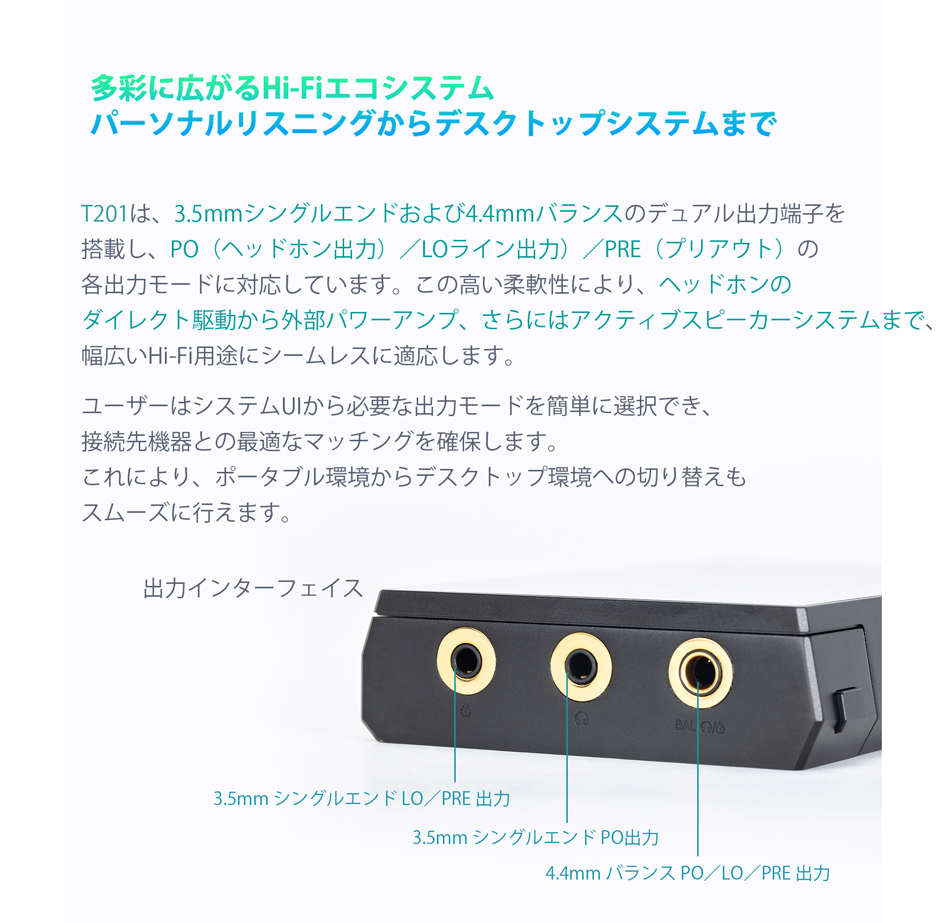 Cayin N6iii T201は、交換可能な第2世代オーディオマザーボードを採用。 ミリタリーグレードのNOS真空管 JAN6418 を2基搭載し、真空管/ソリッドステートの音色切替に対応します。 DACにはフラッグシップ AK4497S を採用し、768kHz PCM/DSD512までのハイレゾ再生をサポート。 3.5mm/4.4mm出力とPO・LO・PREモードにより、ヘッドホンから外部アンプ接続まで幅広く対応します。 ポータブルとデスクトップを自在につなぐ、拡張性に優れたHi-Fiプレーヤーです。