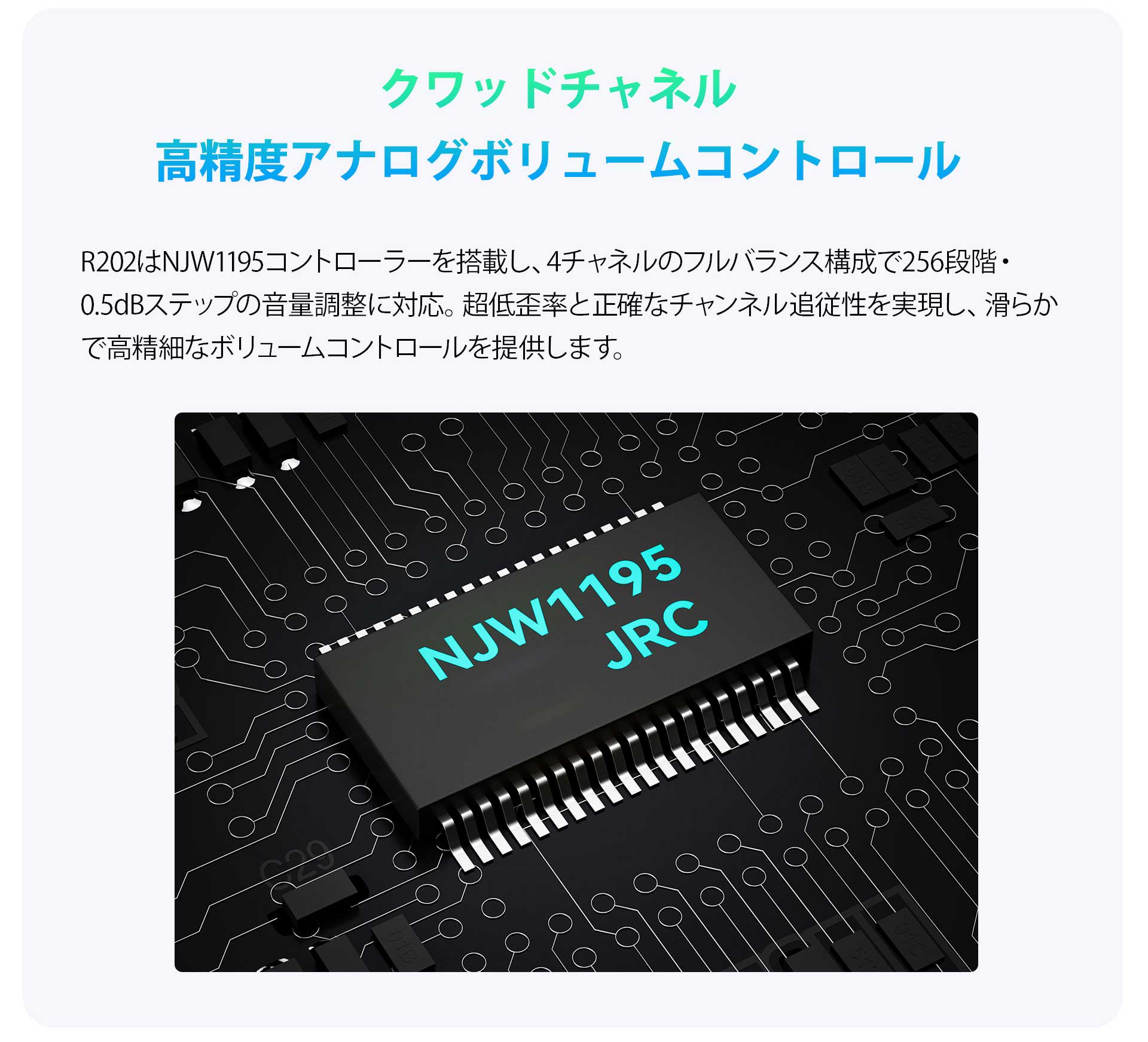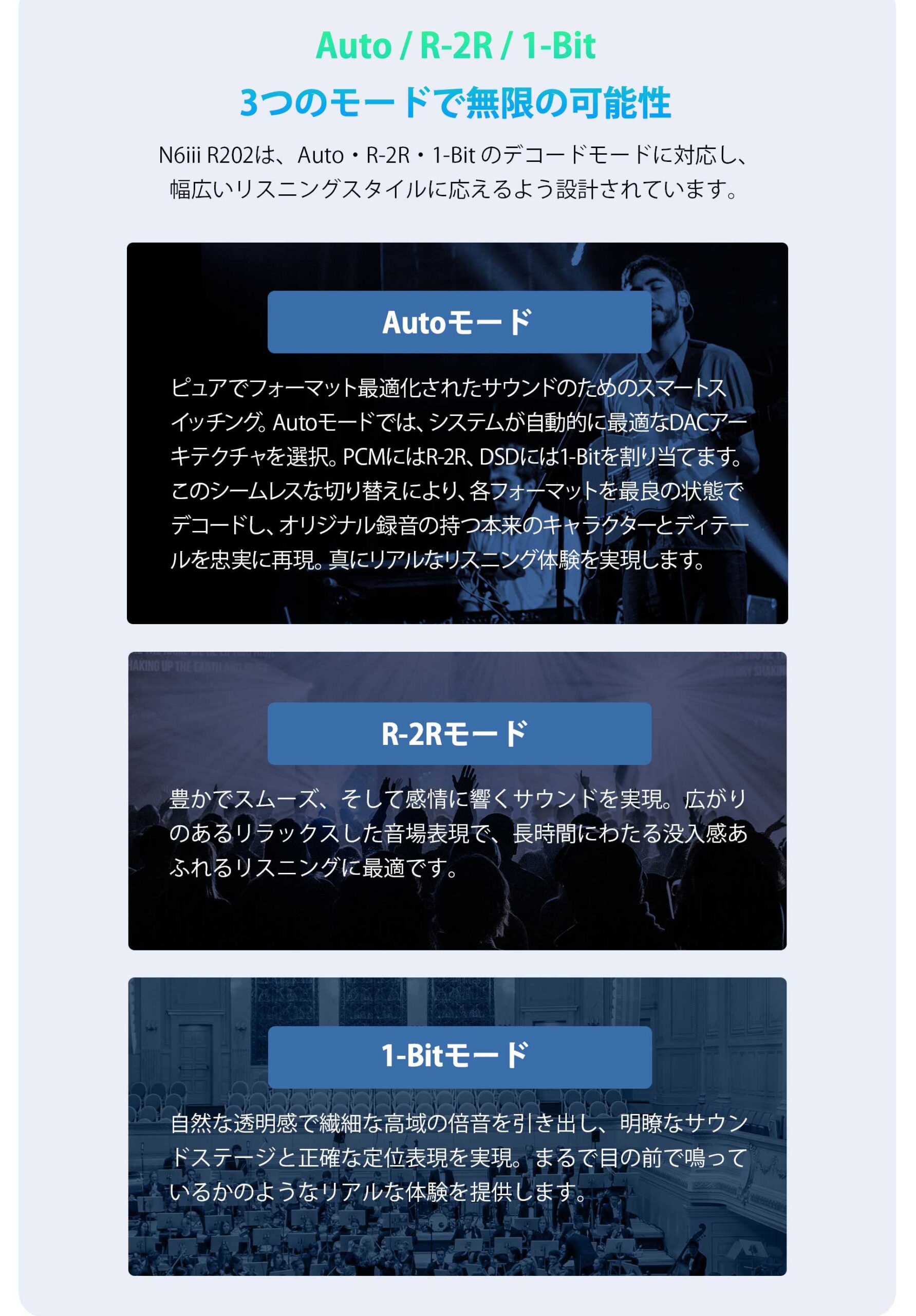 Cayin R202は、N6iii用のオーディオマザーボードではフルバランス24bit R-2R DACを搭載し、ネイティブPCM最大384kHzに対応。超低温度抵抗係数(<5ppm/°C)により、正確なアナログ波形を生成し、歪みを低減。豊かなダイナミックレンジを実現し、臨場感あふれるサウンドを提供します。また、Auto・R-2R・1-Bit のデコードモードに対応し、幅広いリスニングスタイルに応えるよう設計されています。