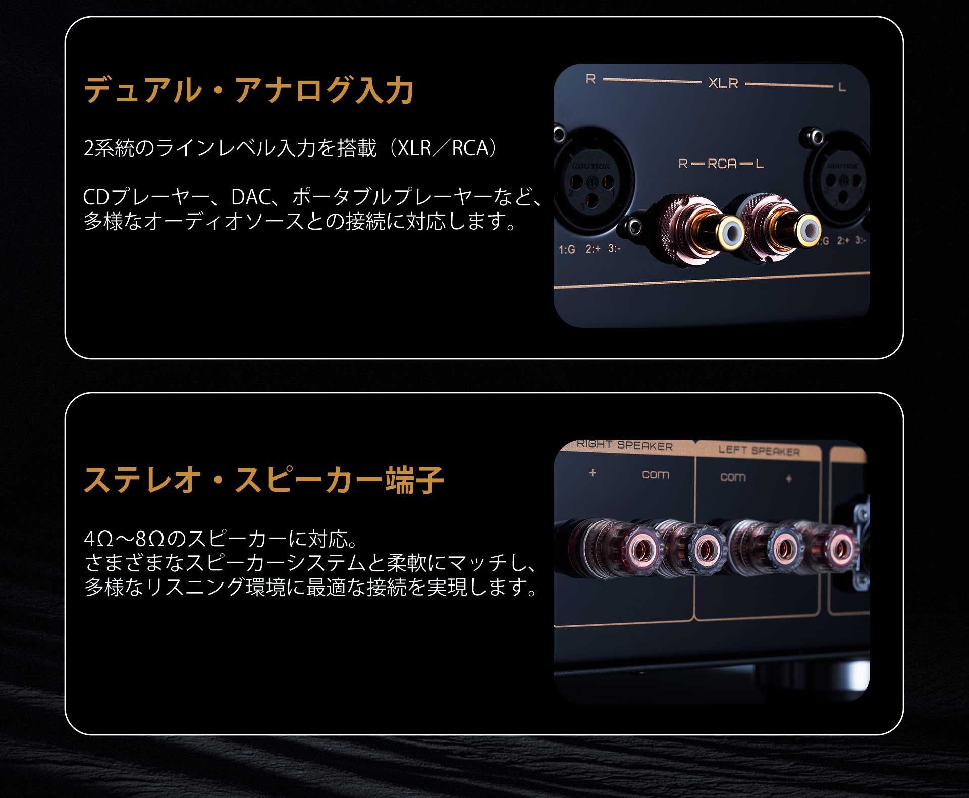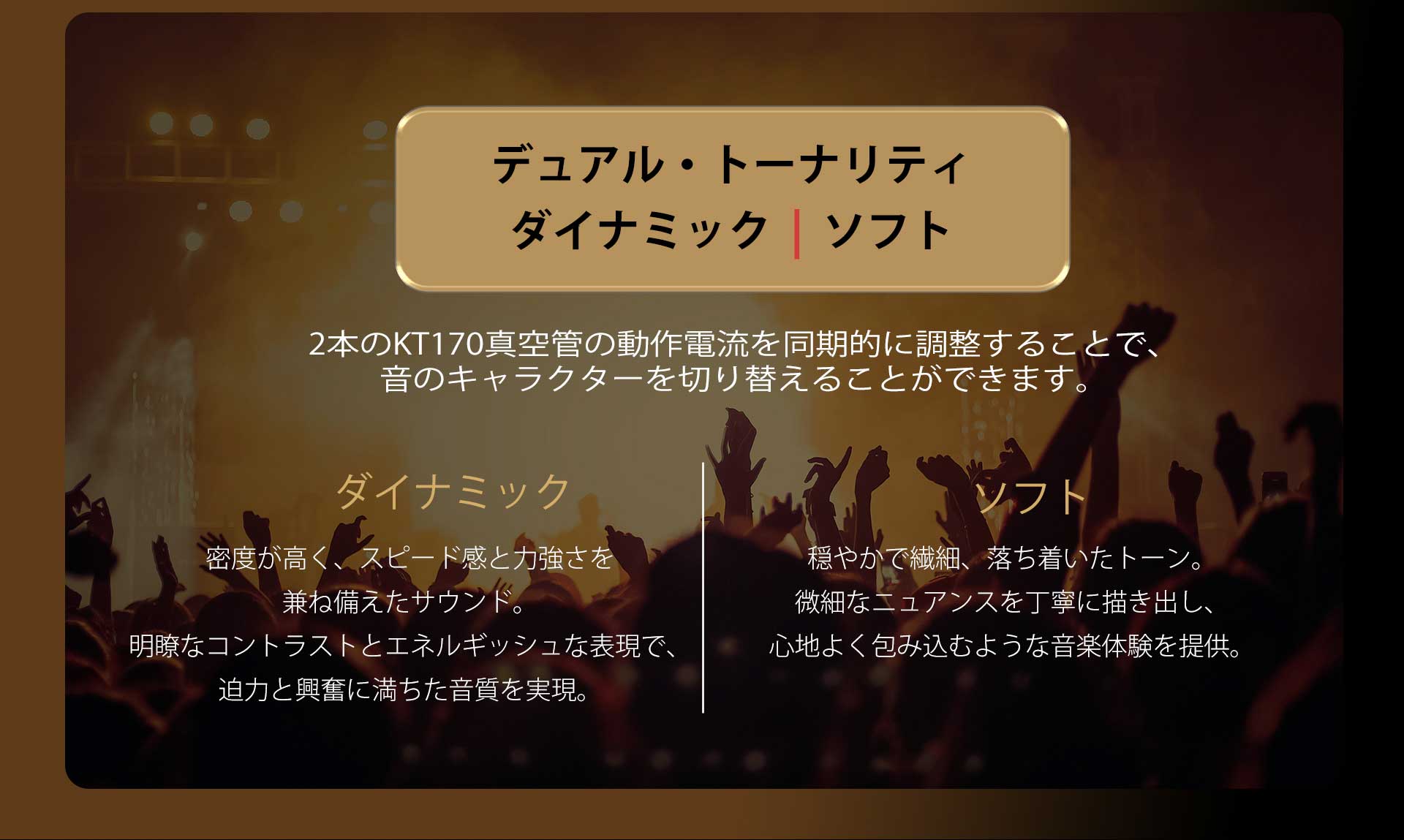 Cayin Soul 170HAは、KT170真空管を搭載し、シングルエンド純A級を誇る真空管ならではの温かみと現代的な精度を融合させたハイエンド・ヘッドホンアンプです。独自のダイナミック・オートバイアス回路により常に最適な動作を維持し、真空管の寿命と安定性を両立。4.4mm・6.35mm・4ピンXLR出力を備え、多様なヘッドホンを理想の状態でドライブします。さらにトライオード/ウルトラリニア切替やDYNAMIC/SOFT音色モードにより、音楽ジャンルや気分に合わせた表現が可能。美しいブラックウォルナットとアルミ筐体が、音とデザインの両面で所有する喜びをもたらします。