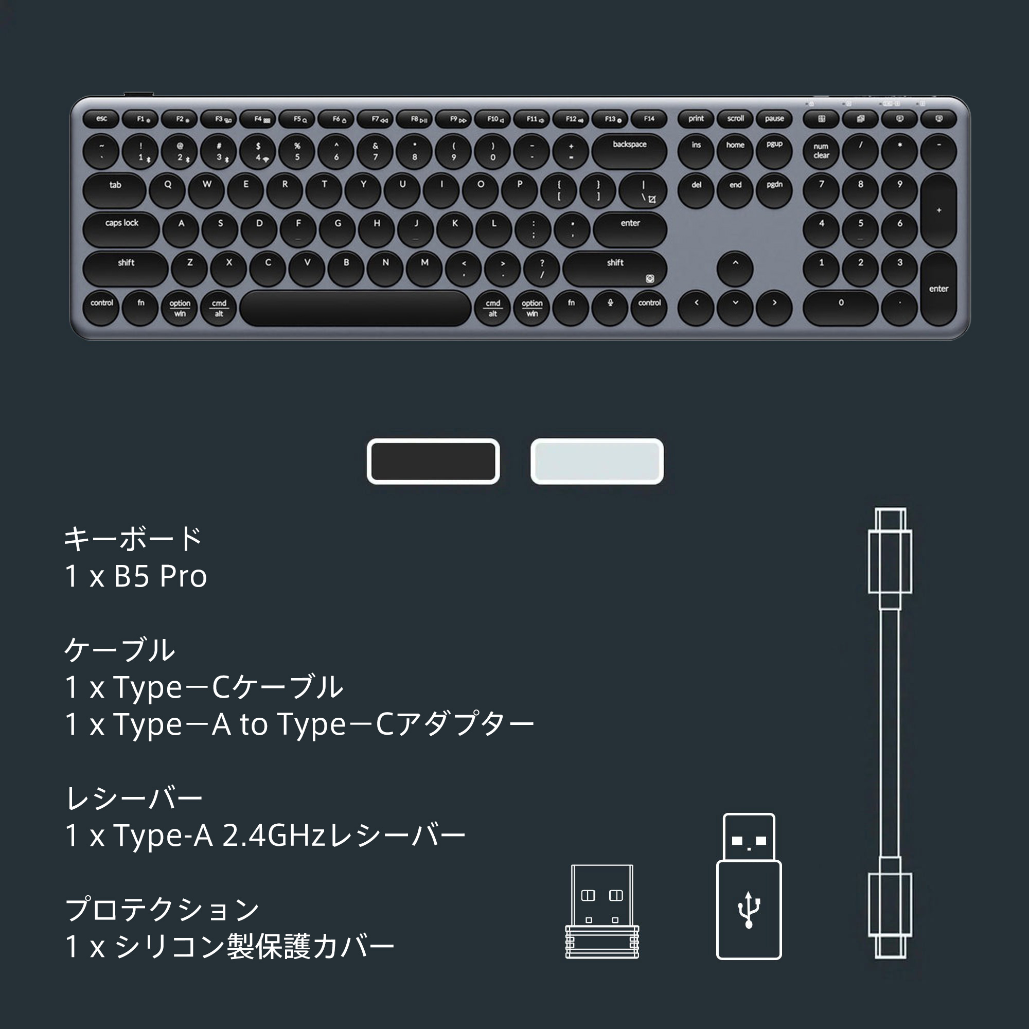 より安定した2.4GHzワイヤレス接続を実現するため、B5 ProにはType-Aレシーバーが付属しています。 差し込むだけで簡単に使用できるプラグ&プレイに対応。使用しないときは、キーボード左上の専用ストレージスロットに収納できます。