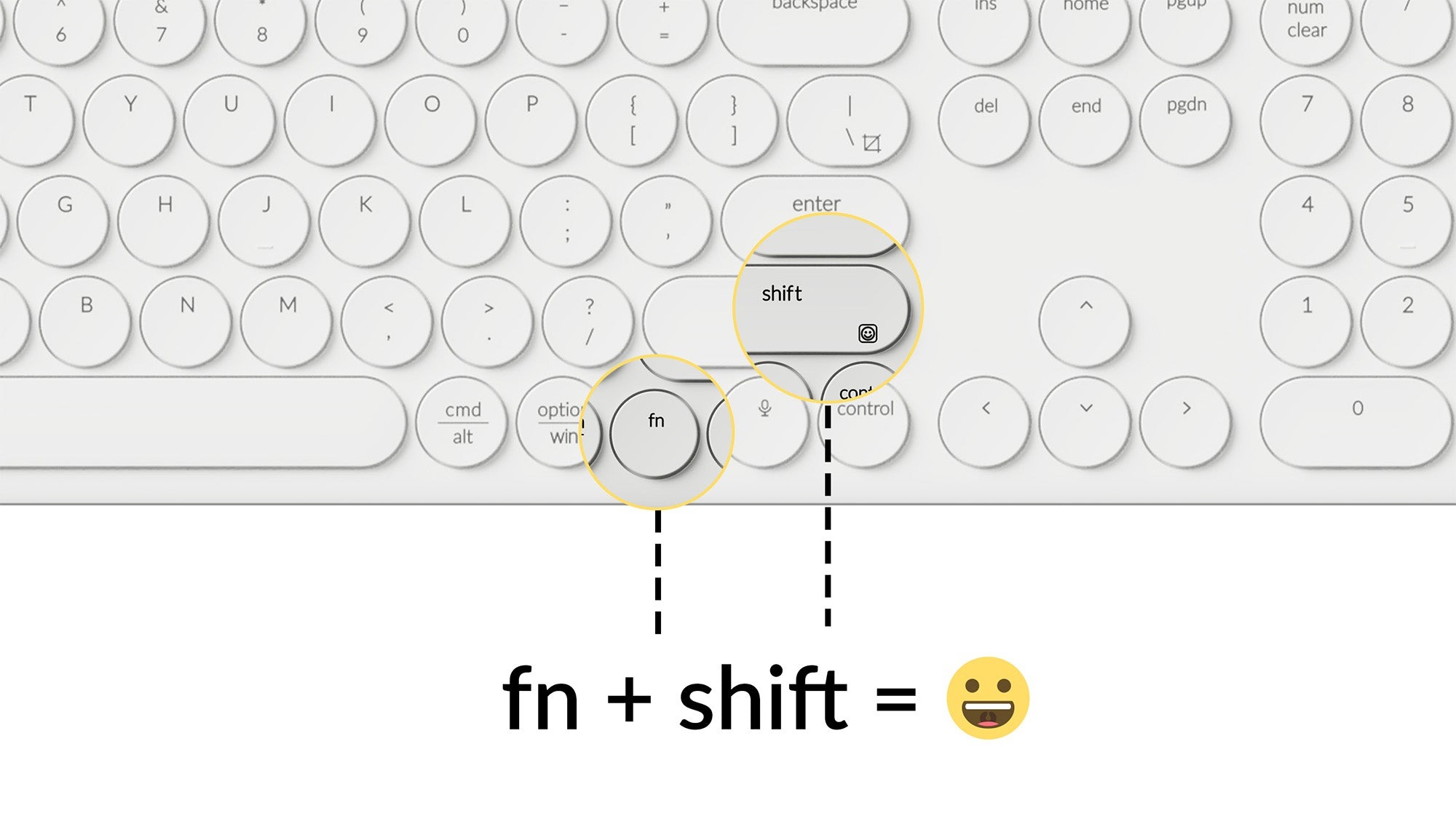 「fn」+「shift」を押すだけで、タイピング中に簡単に絵文字を呼び出すことができます。 素早く感情を表現でき、メッセージに手軽に個性やニュアンスを加えることができます。