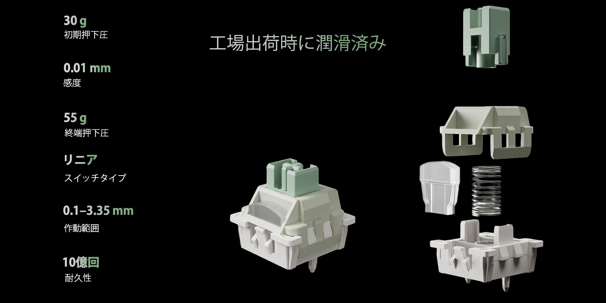 物理的な接点に依存するメカニカルスイッチとは異なり、マグネティックスイッチは磁力によってキー入力を検知します。対応するマグネティックスイッチであれば、スイッチの交換も簡単に行えます。 ※C0 HE 8Kは現在、Gateron、Jade、その他一部のマグネティックスイッチには対応していません。