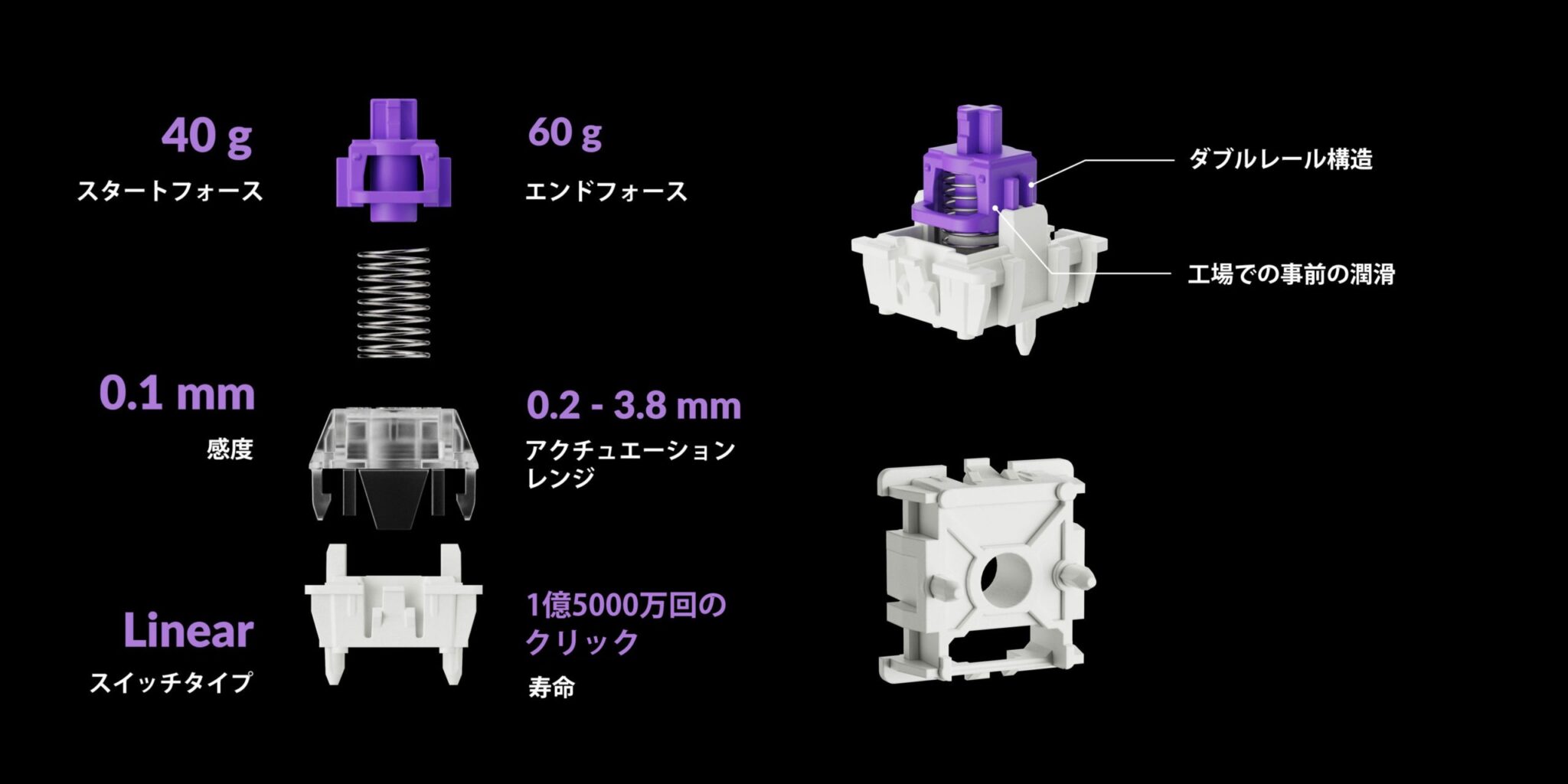 物理的な接点に依存する従来のメカニカルスイッチとは異なり、磁気スイッチは磁力によってキー入力を検知します。対応する磁気スイッチであれば、簡単に交換が可能です。 ※K2 HEは、公式サイトで販売されているダブルレール磁気スイッチのみに対応しています。